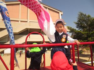 今日は、5歳児が紐をひぱって、上まで揚げました。