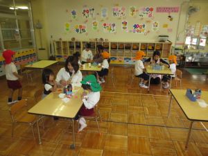 保育室では、紙コップの剣玉作りをしました。